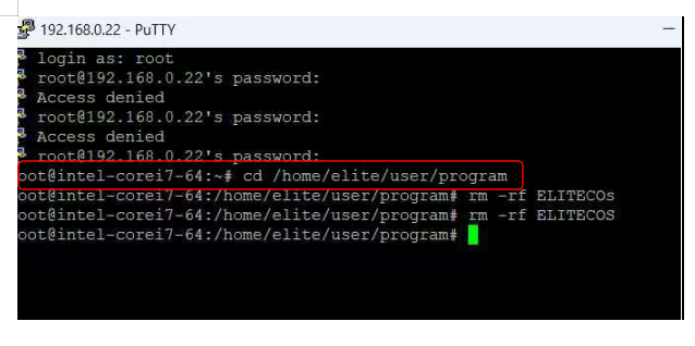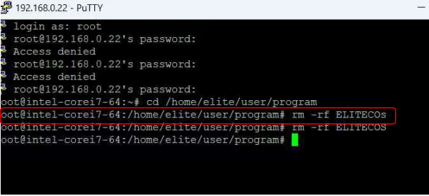 2.1通過(guò)本地PC連接到控制器,使用ssh登錄的方式登錄到控制器內(nèi)部,刪除ELITECOs文件。該方法支持任意控制軟件版本下。