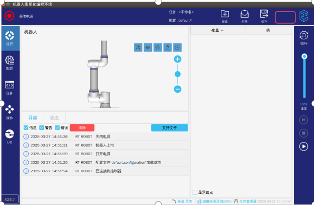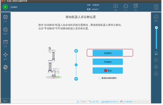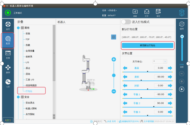 第三步:退出專(zhuān)家模式,這個(gè)時(shí)候因?yàn)樗欧?bào)警已經(jīng)屏蔽了,所以機(jī)器人可以正常上電了。如圖-3所示在配置界面→選擇打包位→點(diǎn)擊移至默認(rèn)打包位就可以進(jìn)入圖-4界面。