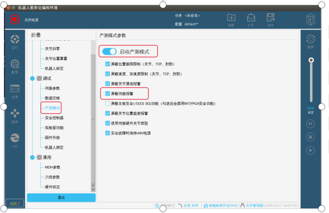 第二步:在專(zhuān)家模式下,選擇產(chǎn)測(cè)模式,啟用產(chǎn)測(cè)模式,勾選屏蔽伺服報(bào)警。如圖-2紅框標(biāo)記所示。
