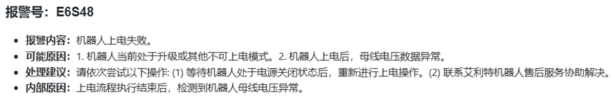 E6S48 報警所指示的是:安全系統(tǒng)報警,機器人上電失敗。其具體釋義如下: