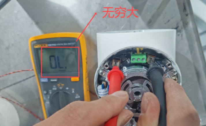 6. 使用萬用表旋轉至蜂鳴檔,測量GND與電機線(或螺柱與電機線),看是否短路,查看阻值是否在千歐以上(千歐以上表示ok)(有蜂鳴聲,GND與電機線導通,表示短路)下圖為正常阻值:
